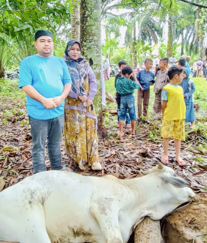 Penyembelihan hewan kurban disaksikan langsung Ketua PWI Paluta Tohong Pangondian Harahap didampingi keluarga di desa Gunung Tua Tonga, usai pelaksanaan shalat idul adha di lapangan futsal desa setempat