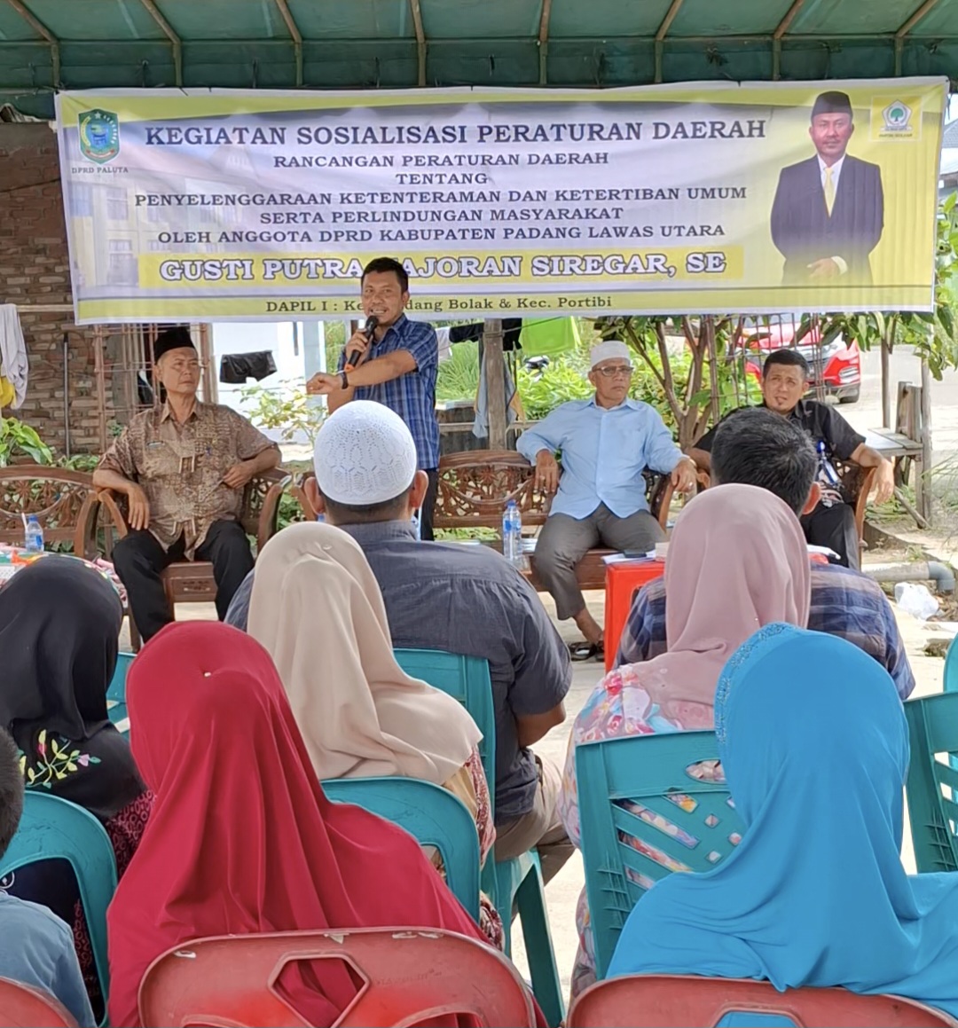 Paluta – Anggota DPRD Paluta, Gusti Putra Hajoran, menggelar kegiatan Sosialisasi Rancangan Peraturan Daerah (Ranperda) tentang Penyelenggaraan Ketentraman dan Ketertiban Umum serta Perlindungan Masyarakat. Kegiatan ini berlangsung di Dapil 1, tepatnya di Lingkungan 1 Partimbakoan, Pasar Gunungtua, Kecamatan Padang Bolak, Kamis (4/12/2025).