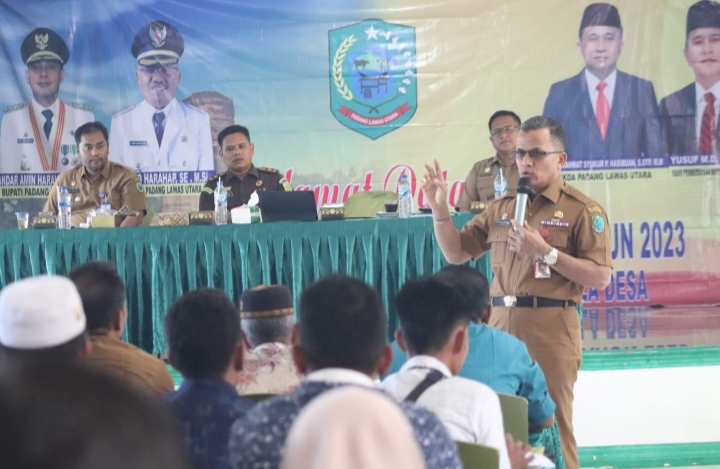 Pemerintah Kabupaten Padang Lawas Utara melalui Dinas Pemberdayaan Masyarakat dan Desa melaksanakan Sosialisasi Peraturan Bupati Padang Lawas Utara Nomor 24 tahun 2023 Tentang Pelaksanaan Pemilihan Kepala Desa Kabupaten Padang Lawas Utara, Senin (10/07/2023).
