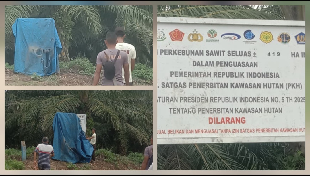 “Plang penyegelan Satgas PKH diduga sengaja ditutupi menggunakan tenda oleh pihak PT Hexa Setia Sawita"