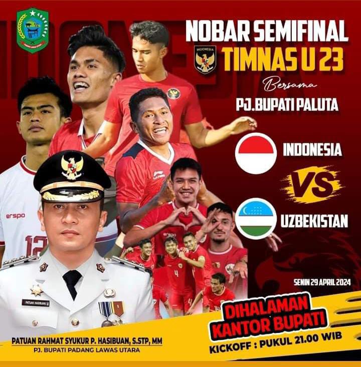 PALUTA - Pemerintah Kabupaten Padang Lawas Utara (Paluta) akan menggelar Nonton Bareng (Nobar) laga Timnas Indonesia menghadapi Uzbekistan pada babak Semi Final Piala Asia U-23 2024.