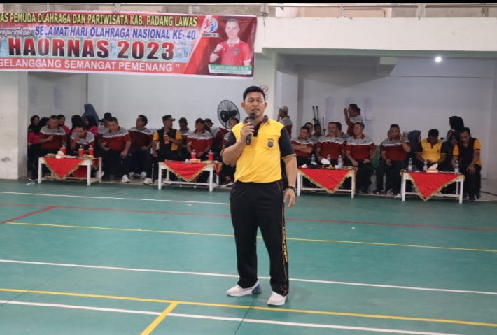 Polisi Resor Kabupaten Padang Lawas mensosialisasikan bahaya Narkoba Kepada peserta Senam Sehat dalam rangka memeriahkan HORNAS KE 40, di Gedung Olah Raga (GOR) BERCAHAYA, Kabupaten Padang Lawas, Selasa 12 September 2023.