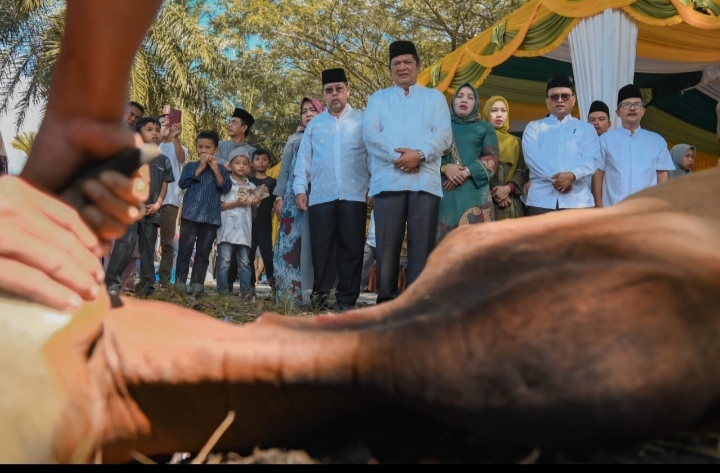 Usai melaksanakan sholat Idul Adha, Wali Kota dan Wakil Wali Kota Padangsidimpuan bersama keluarga dan jajaran Pemerintah Kota Padangsidimpuan melaksanakan penyembelihan hewan qurban di Kelurahan Ujung Padang, Kecamatan Padangsidimpuan Selatan, Kamis (29/06/23).