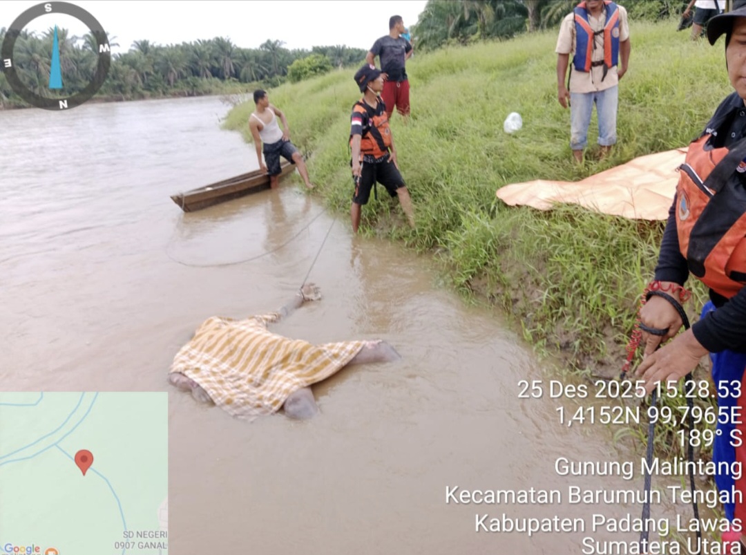 Korban ditemukan pada Kamis sore (25/12/2025) sekitar pukul 15.30 WIB, mengapung di Sungai Barumun, tepatnya di wilayah Binanga, Desa Lobu Manombo, Kecamatan Barumun Tengah. Penemuan tersebut dilakukan oleh Tim SAR gabungan bersama petugas kecamatan dan masyarakat setempat.